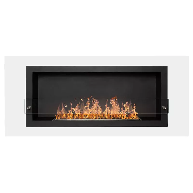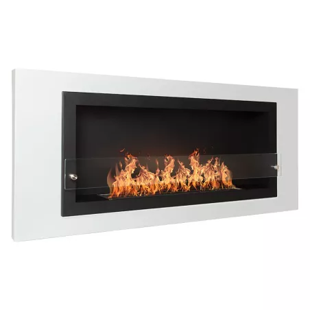 Bicolor, con un marco de 6,5 cm de grosor en blanco mate y un cuerpo en negro mate, la chimenea Oxford XL dispone de un cristal protector de vidrio templado sujeto por 2 tornillos que deben atornillarse en la parte delantera de la chimenea.