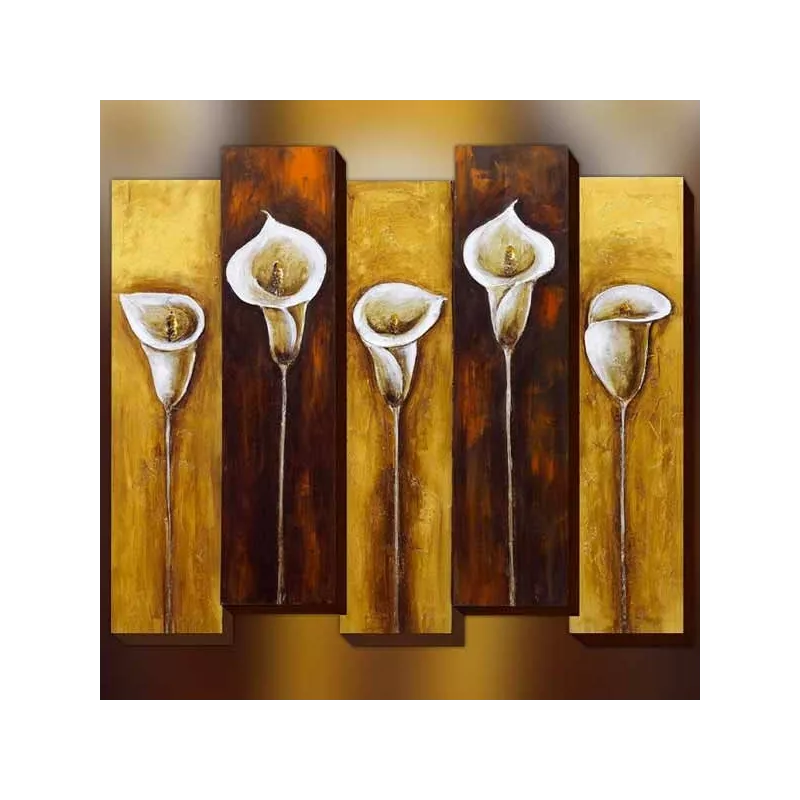 Este cuadro utiliza un motivo floral, ejecutado en forma de pintura en relieve. Realizado en 3D, incluye 5 paneles: los dos exteriores y el central tienen un fondo marrón/mostaza, mientras que otros dos paneles, que rodean al central, son más bien de tonos chocolate. Estos últimos paneles parecen sobresalir del marco, colocados a mayor altura que los otros tres.