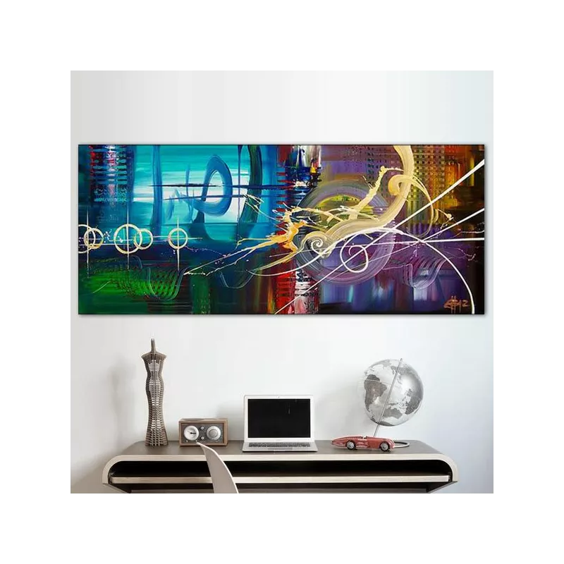 Este panorama se divide en cuatro zonas, cada una de las cuales explota paisajes abstractos. Estas zonas se distinguen en el fondo por sus colores. Hay azul, verde, rojo-naranja y malva. El primer plano explota un movimiento que recorre el cuadro de izquierda a derecha, con elementos circulares y volutas.